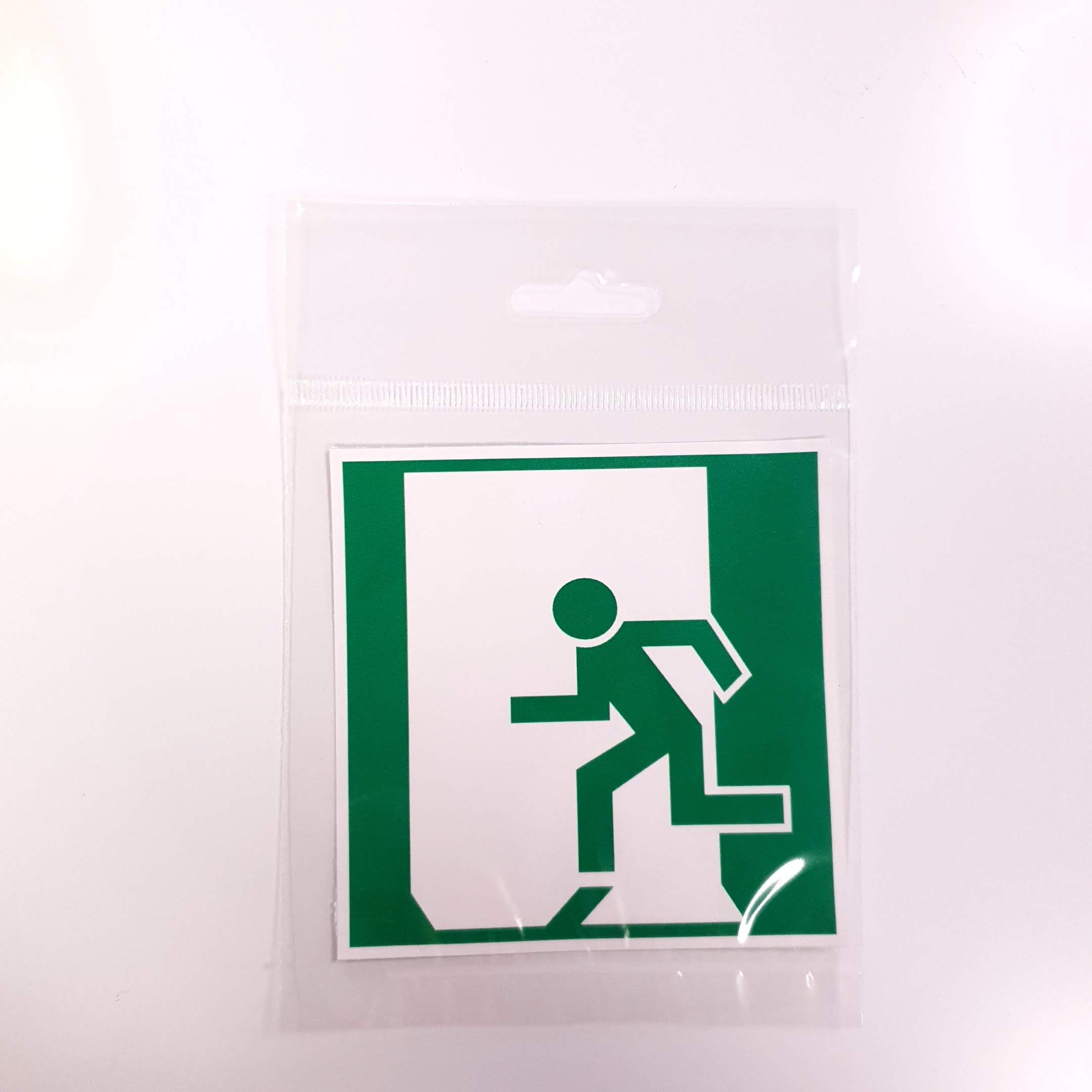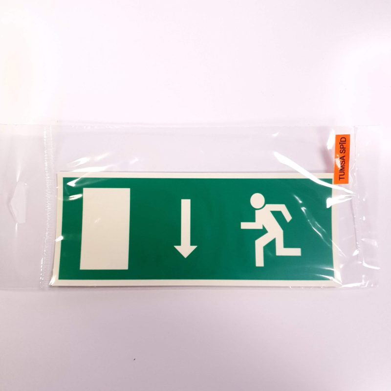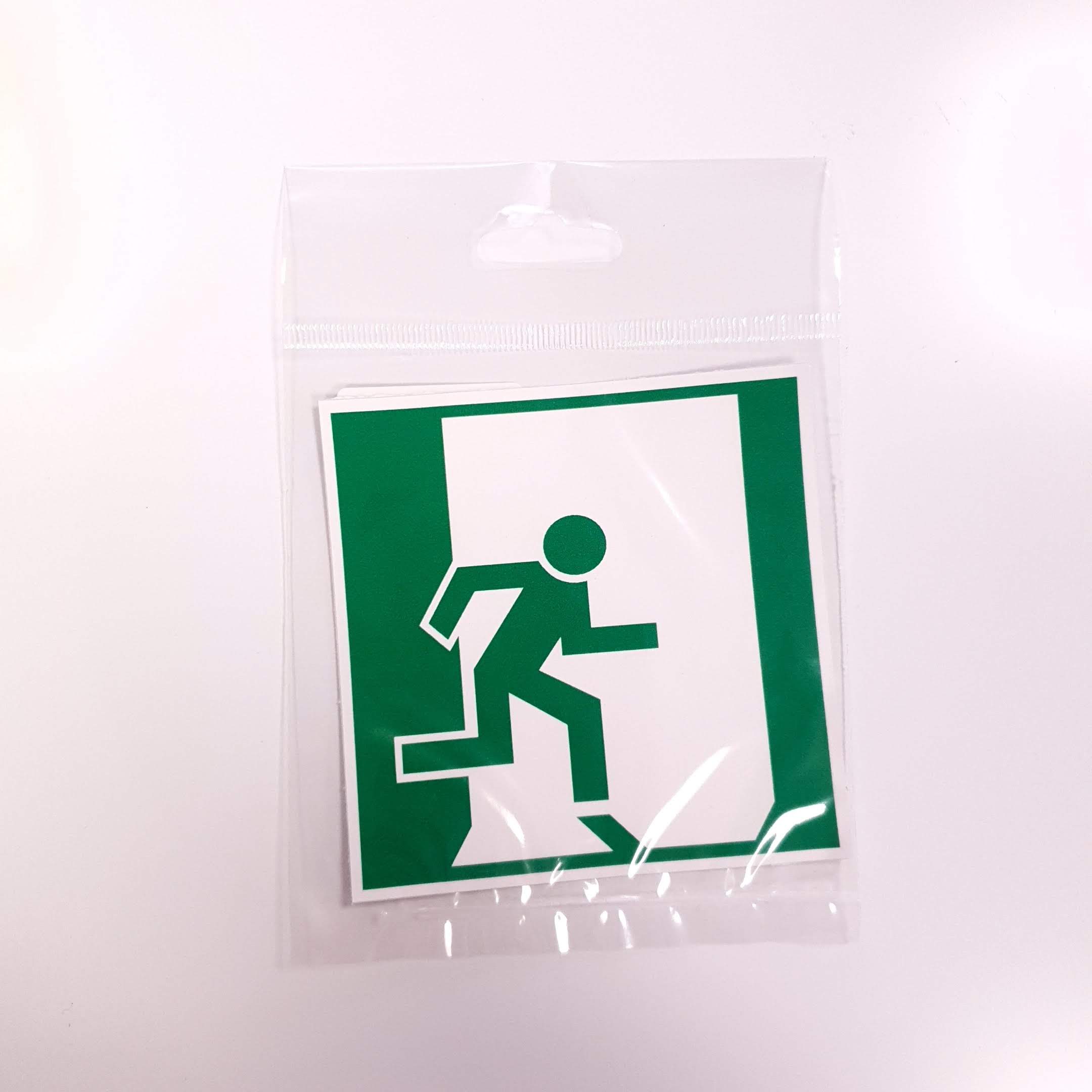 Dažādas evakuācijas uzlīmes. Evakuācijas izeja pa labi. Evakuācijas izeja lejā. Evakuācijas izeja pa kreisi.