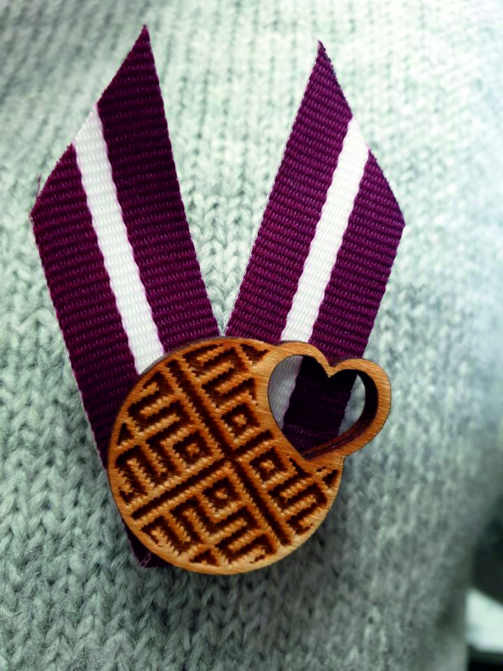 LV karoga piespraude Es mīlu Latviju, apģērba piespraude Latvijas svētkos ar Latvijas karoga lentīti un gravētu simbolu – sirdi.