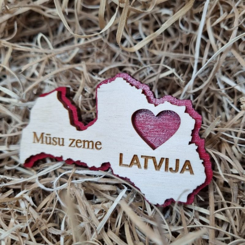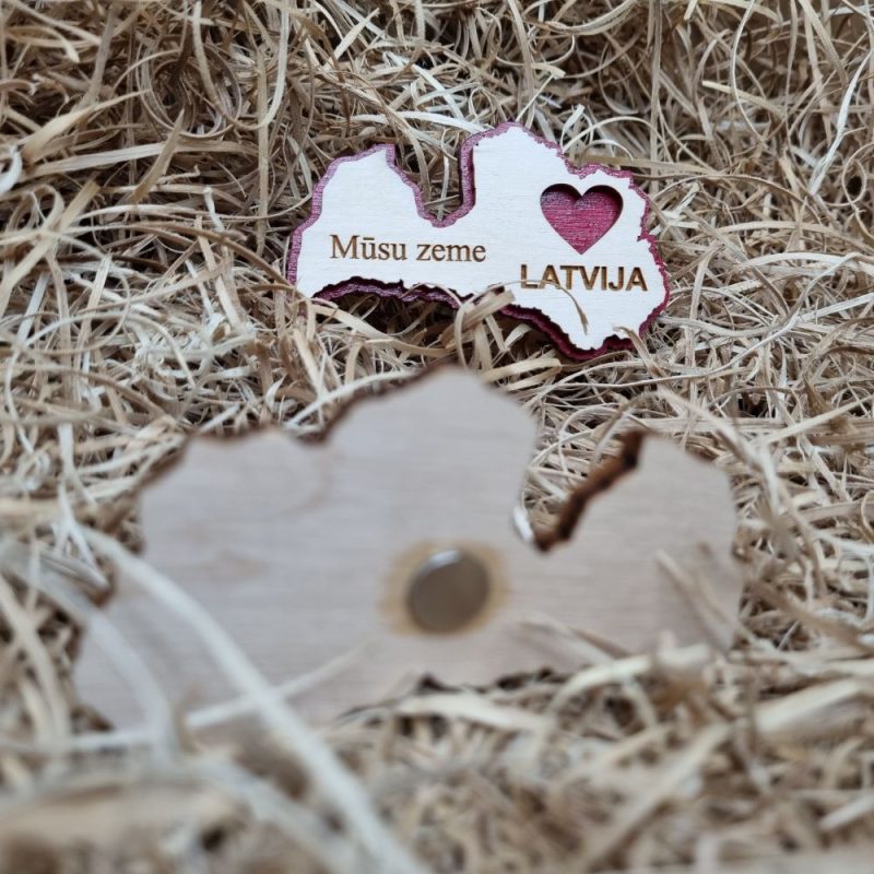 Suvenīrs ar Latvijas simboliku, kuru var piestiprināt pie ledusskapja vai kur citur. Krāsas kontrastējoši košas. Latvijas kontūra izgriezta ar lāzeri no finiera materiāla. Aizmugurē mazs magnēts, kas ļaus to piestiprināt pie magnētiskām virsmām.