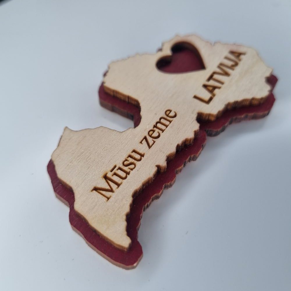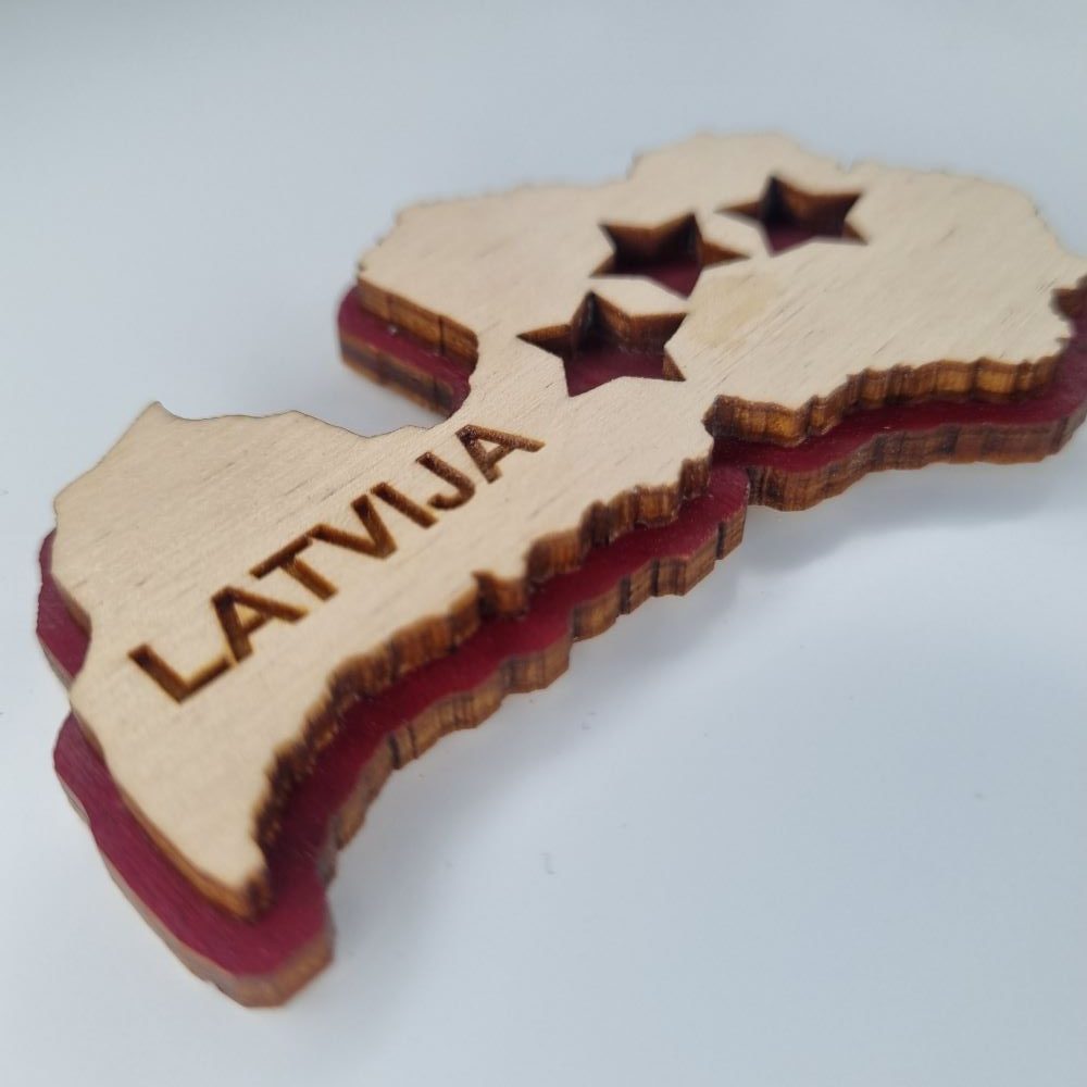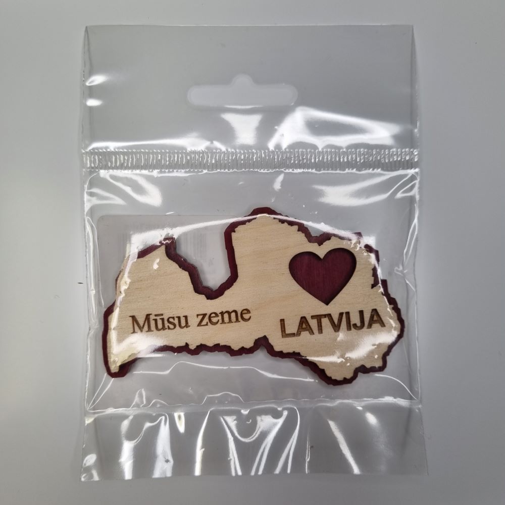 Suvenīrs ar Latvijas simboliku, kuru var piestiprināt pie ledusskapja vai kur citur. Krāsas kontrastējoši košas. Latvijas kontūra izgriezta ar lāzeri no finiera materiāla. Aizmugurē mazs magnēts, kas ļaus to piestiprināt pie magnētiskām virsmām.
