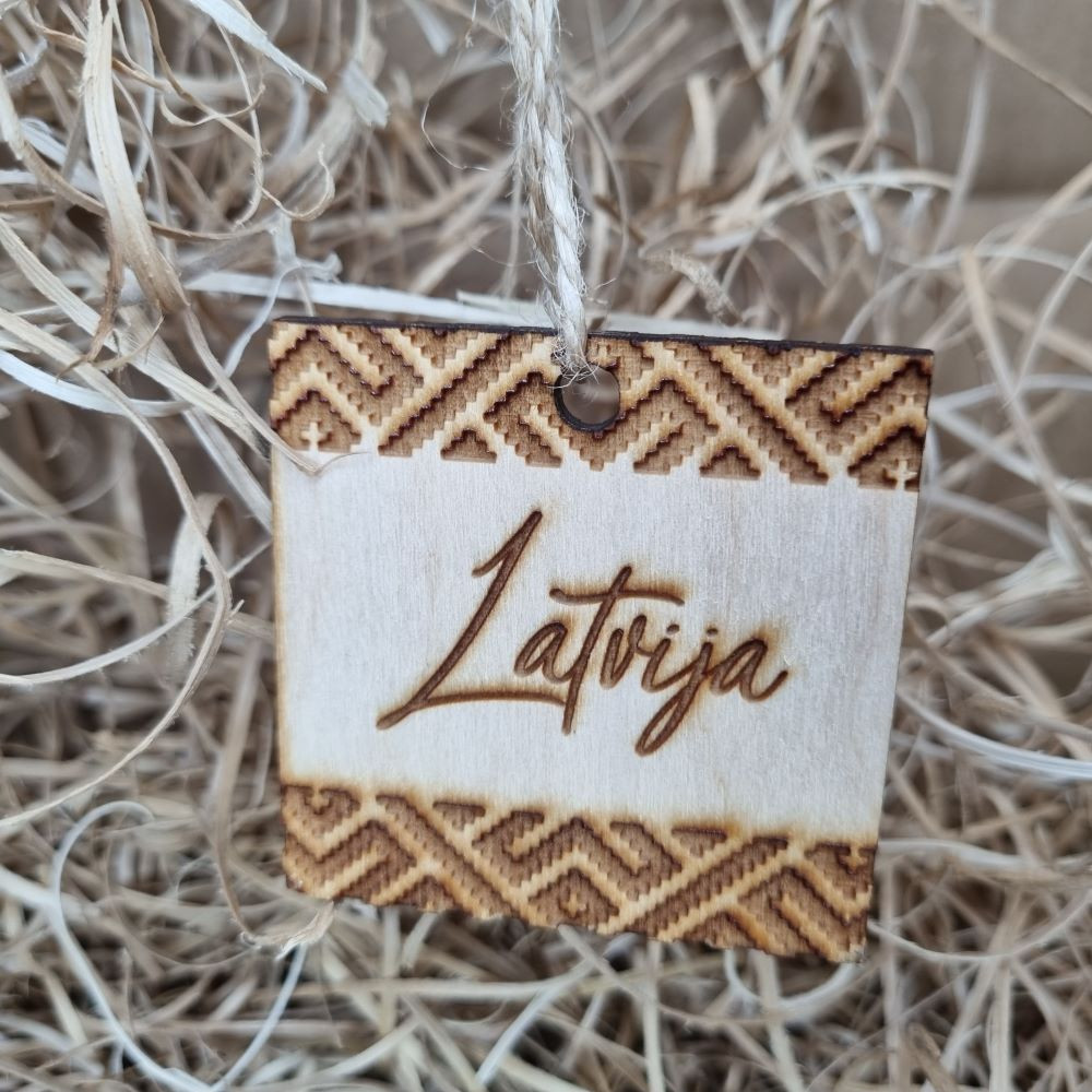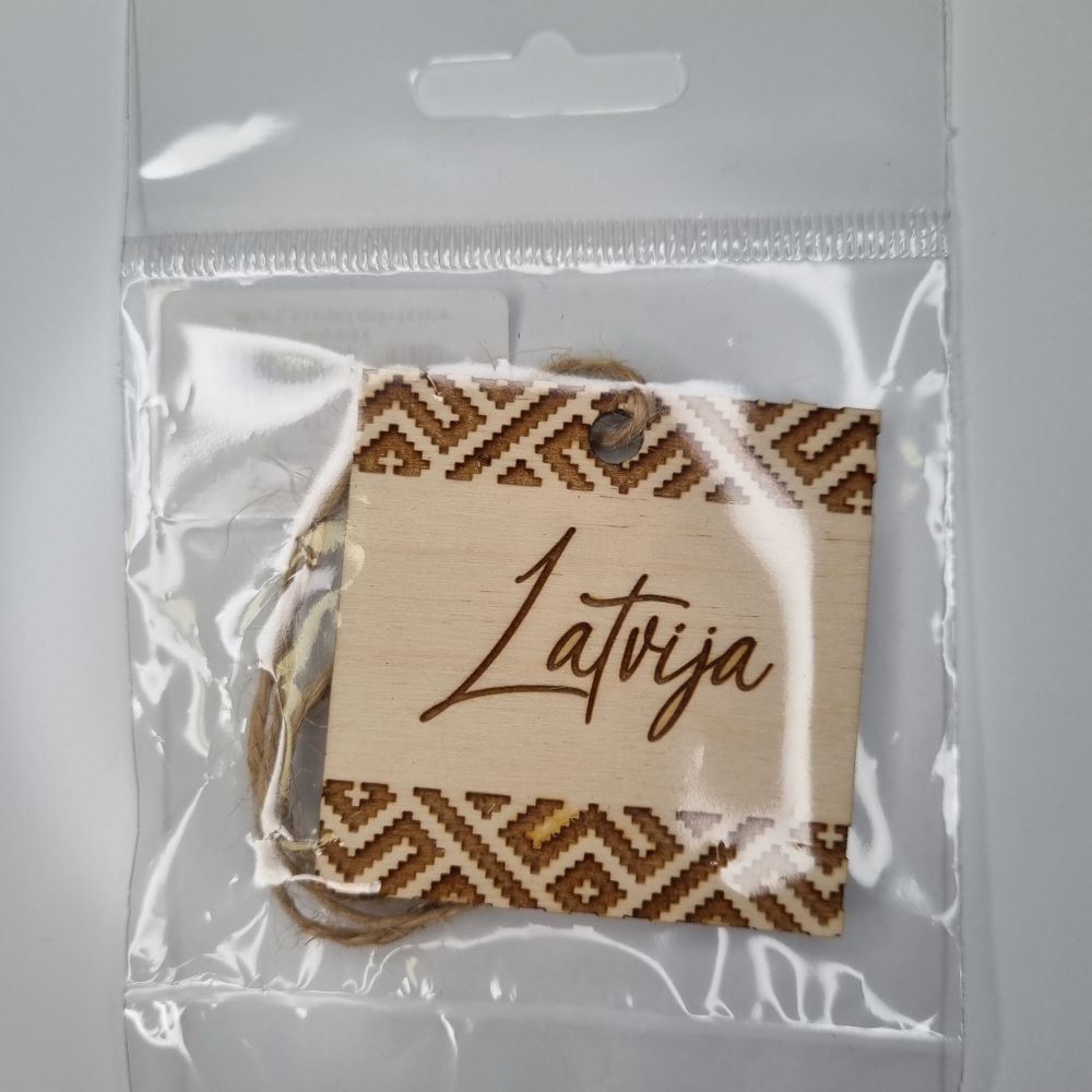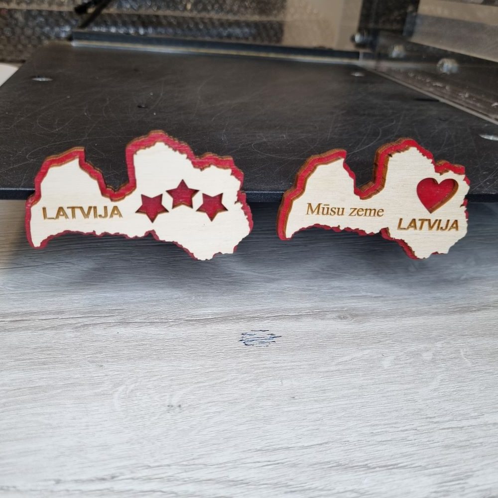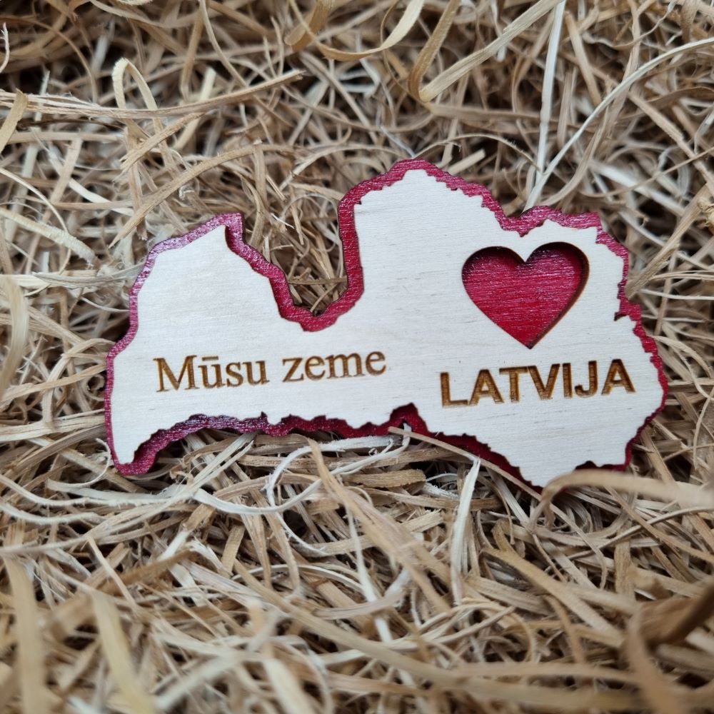 Suvenīrs ar Latvijas simboliku, kuru var piestiprināt pie ledusskapja vai kur citur. Krāsas kontrastējoši košas. Latvijas kontūra izgriezta ar lāzeri no finiera materiāla. Aizmugurē mazs magnēts, kas ļaus to piestiprināt pie magnētiskām virsmām.