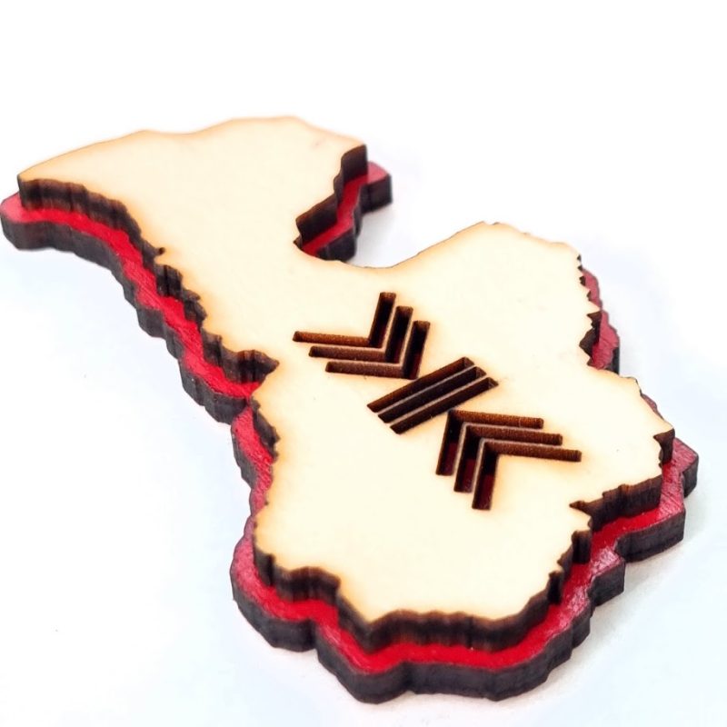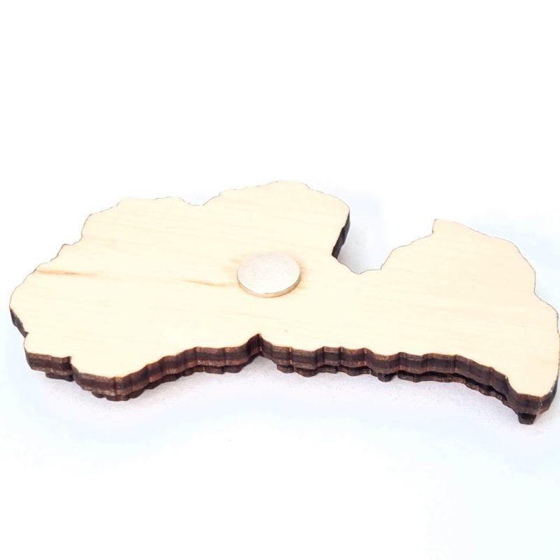 Suvenīrs ar Latvijas simboliku, kuru var piestiprināt pie ledusskapja vai kur citur. Krāsas kontrastējoši košas. Latvijas kontūra izgriezta ar lāzeri no finiera materiāla. Aizmugurē mazs magnēts, kas ļaus to piestiprināt pie magnētiskām virsmām.