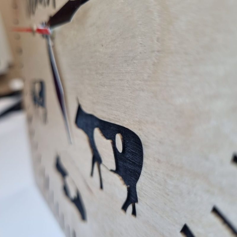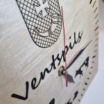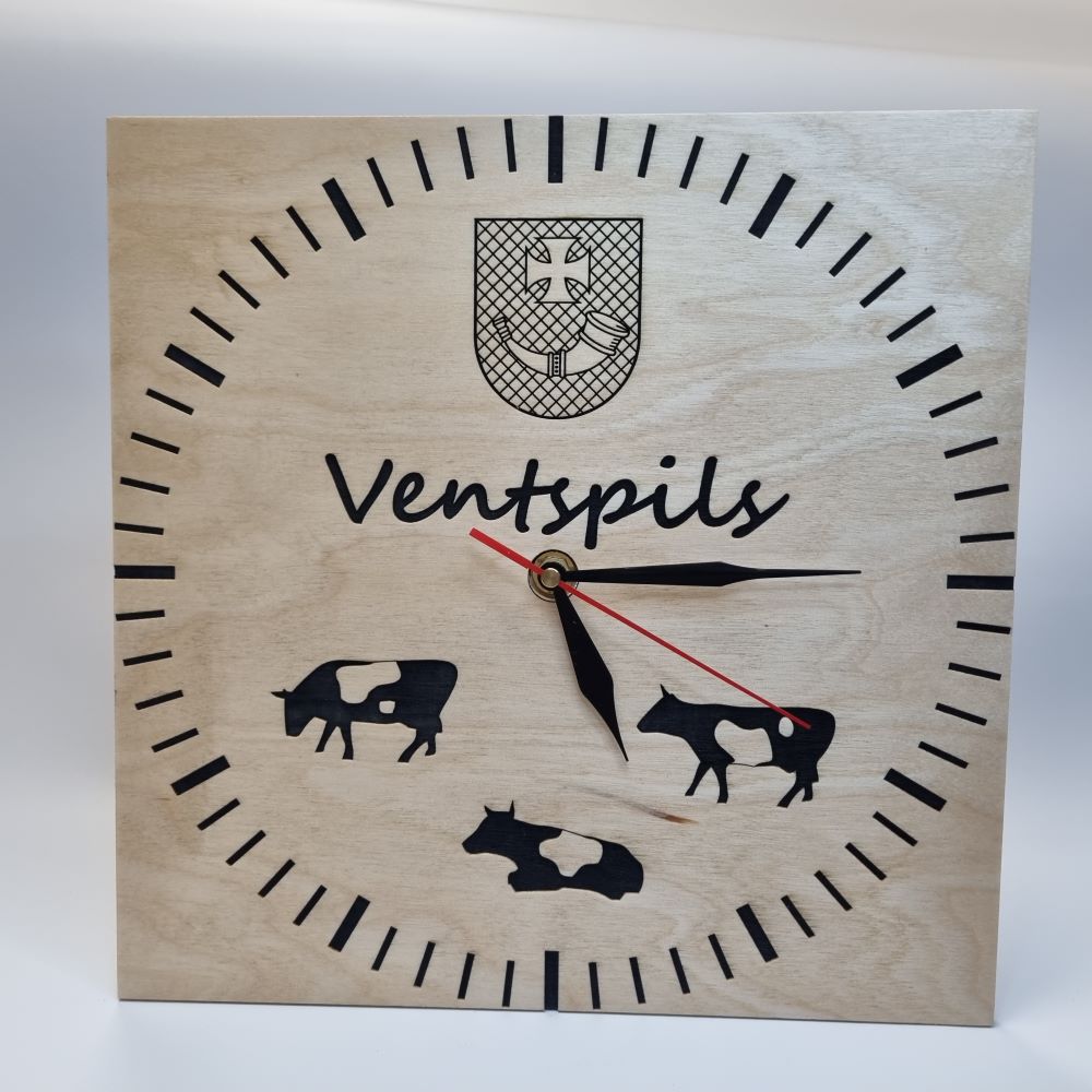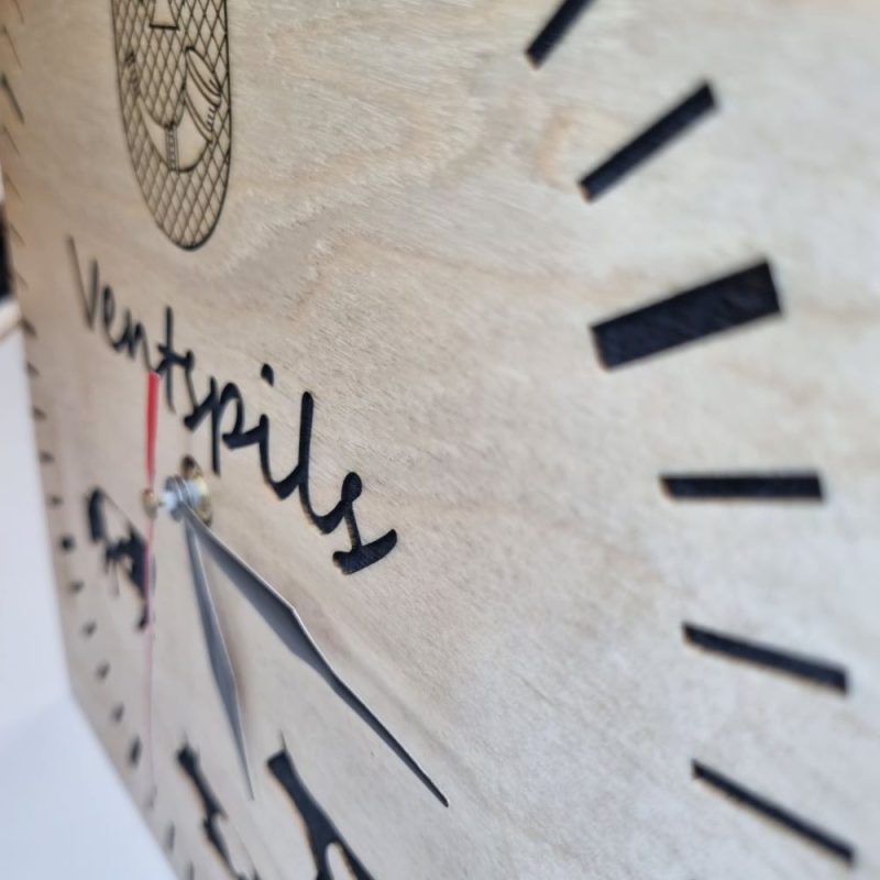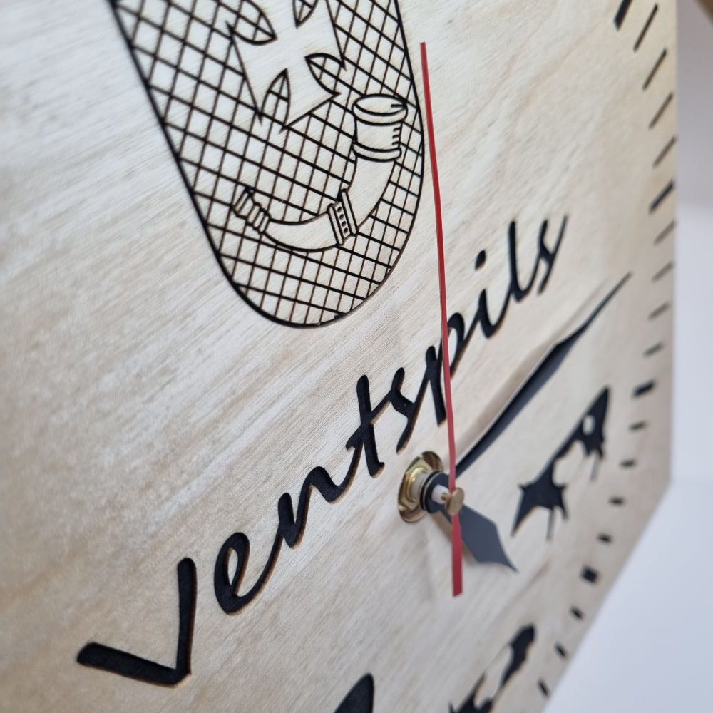Koka pulkstenis Ventspils ar pilsētas ģērboni.